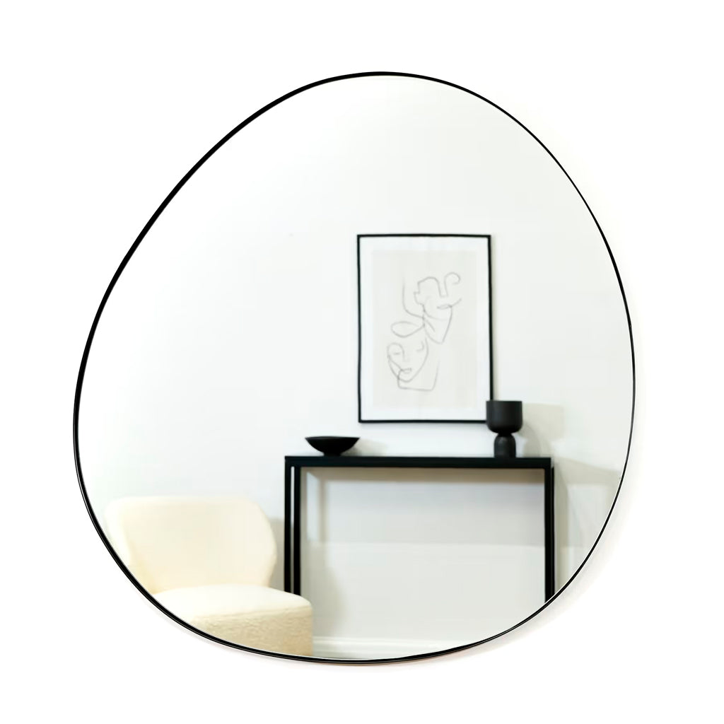 El espejo "Zambune" es una pieza de diseño moderno y fluido que destaca por su forma asimétrica y contornos suaves. Su estructura con marco negro le da un aspecto elegante y contemporáneo, ideal para quienes buscan un toque de originalidad en su decoración.