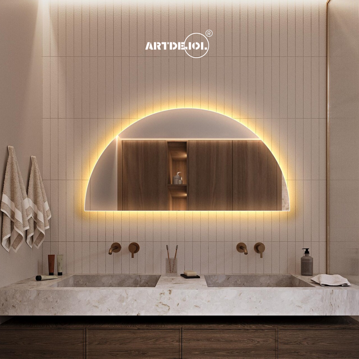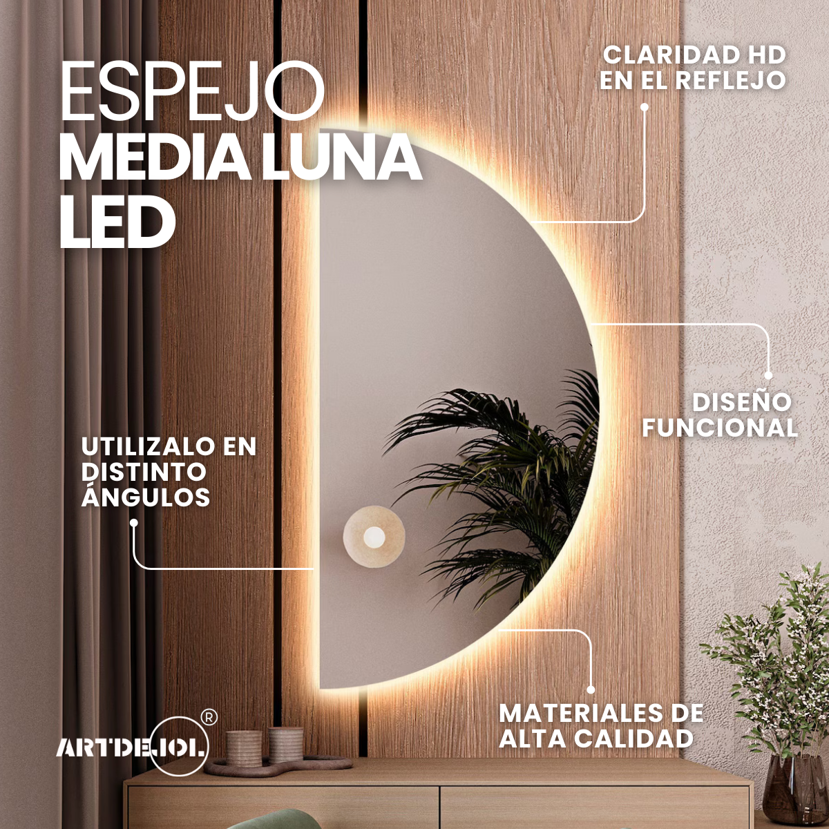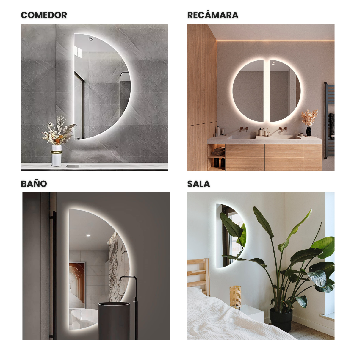 Este espejo LED en forma de medio círculo combina diseño contemporáneo con funcionalidad avanzada. Su iluminación integrada y silueta asimétrica crean un efecto visual sorprendente, ideal para baños o entradas que buscan un toque artístico y moderno. Una pieza que desafía lo convencional y celebra la creatividad.