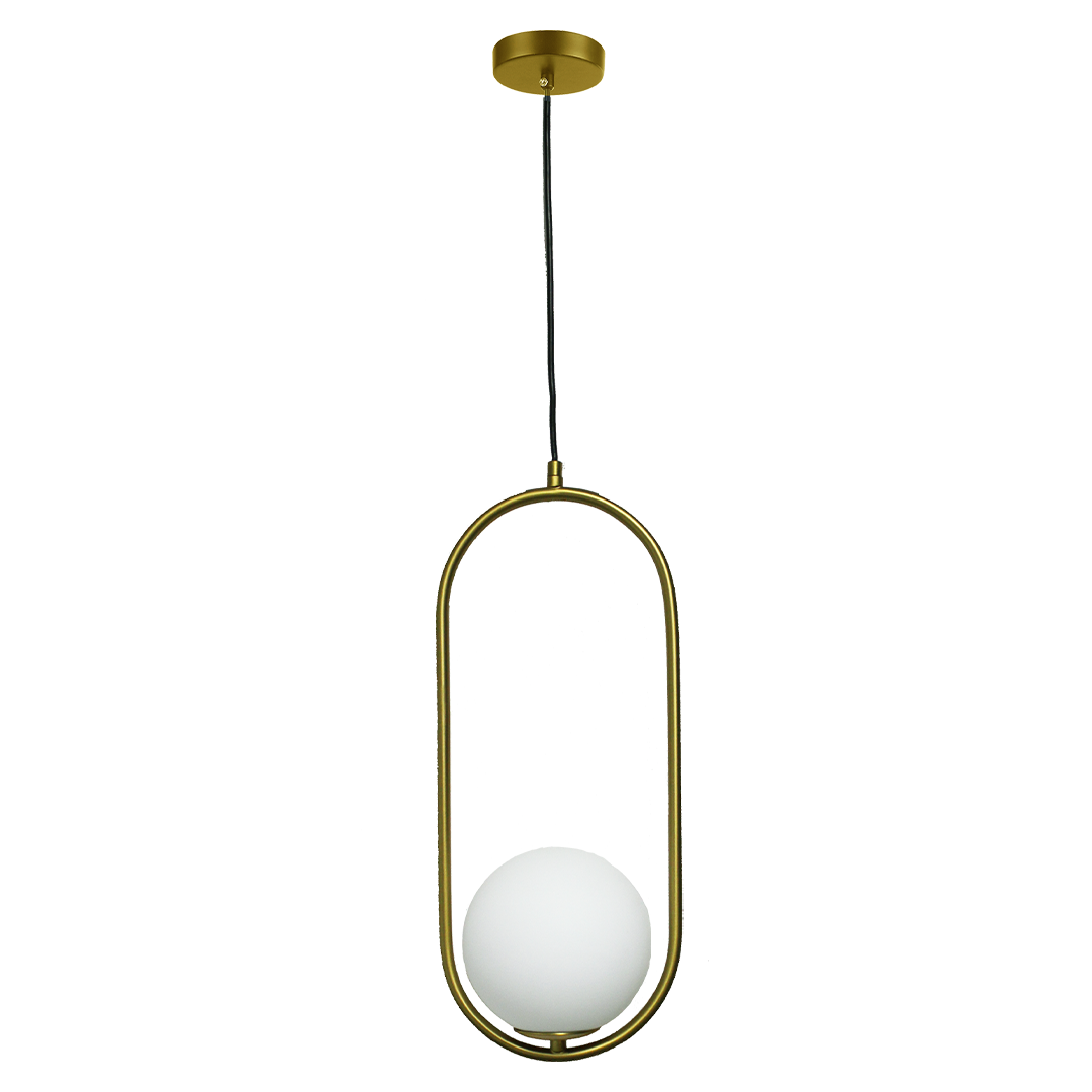 La "lámpara Xioné" es una oda al diseño minimalista con influencia escultórica. Su estructura ovalada de acabado dorado sostiene una esfera opalina que parece flotar, generando una atmósfera suave y envolvente. Ideal para interiores modernos o art déco, es perfecta para entradas, comedores o pasillos donde el diseño y la luz sean protagonistas.