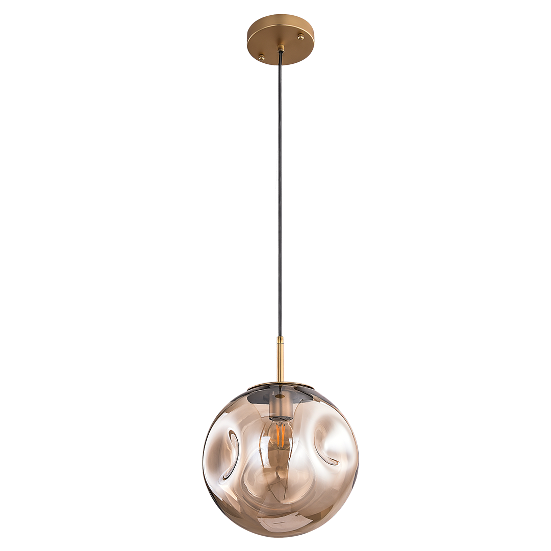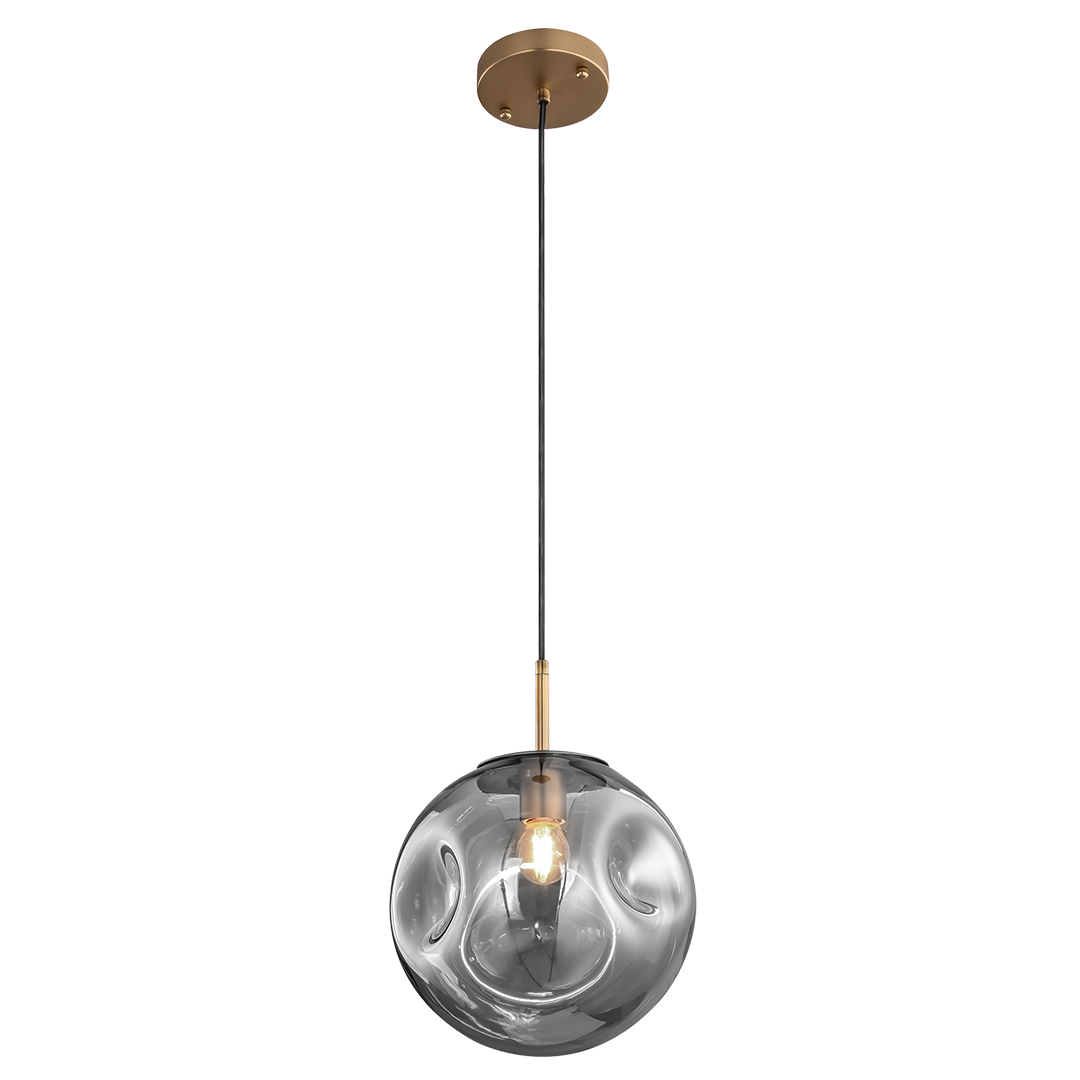 Lámpara Paretos captura la belleza del vidrio soplado con una esfera ahumada de acabados ondulados que parecen flotar en el aire. La calidez del dorado en su estructura contrasta con el gris profundo de la pantalla, proyectando una luz suave y envolvente. Perfecta para espacios que buscan sofisticación con un toque artístico.