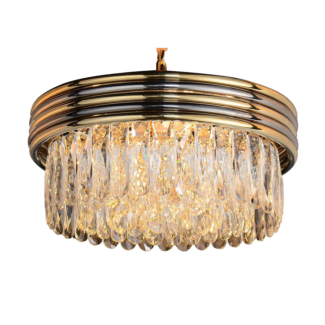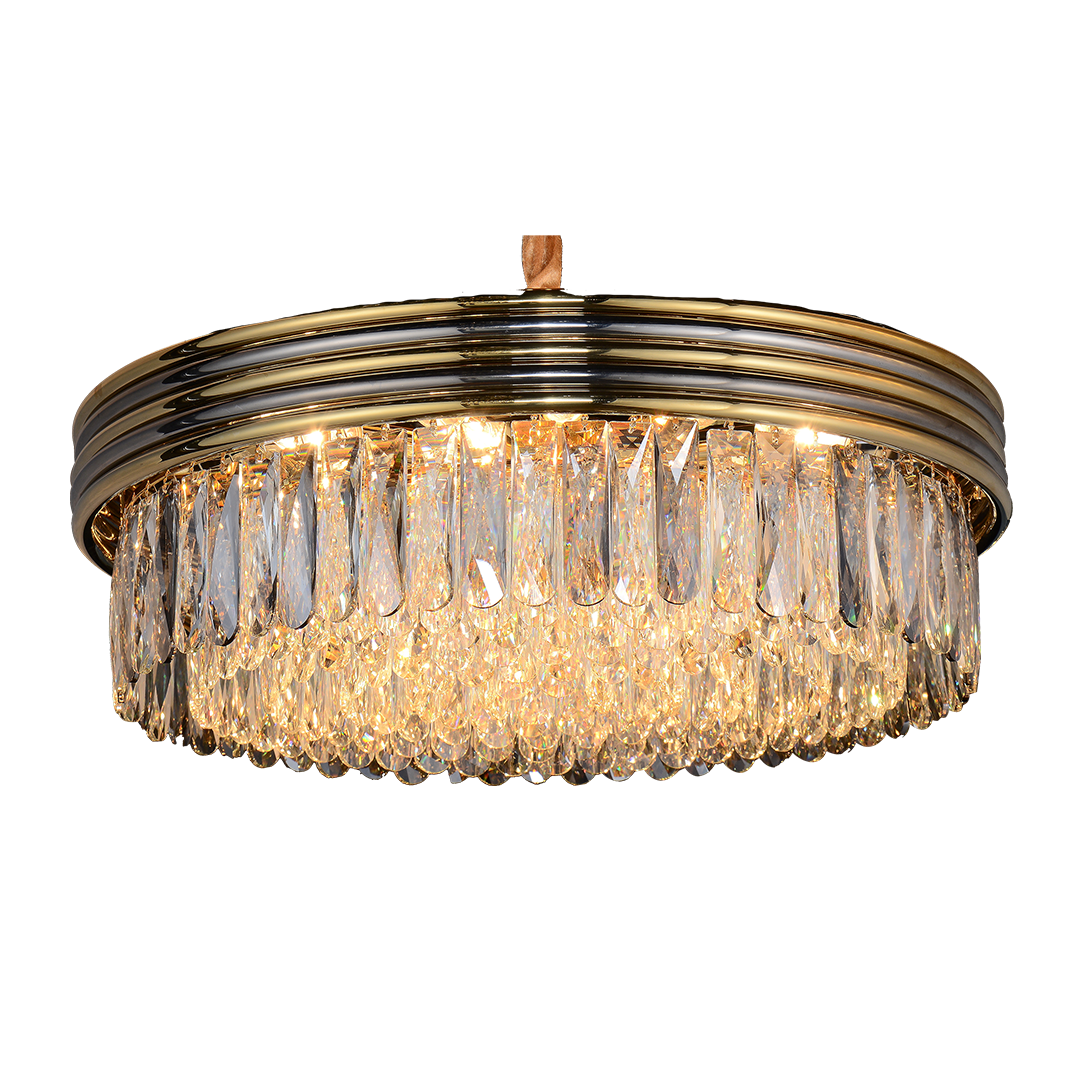 La "lámpara Rings" combina la opulencia del cristal tallado con un diseño circular moderno en acabado metálico dorado envejecido. Su estructura alberga múltiples gotas de cristal que atrapan la luz, proyectando destellos cálidos y elegantes. Perfecta para iluminar salas, comedores o vestíbulos con un aire majestuoso y refinado.