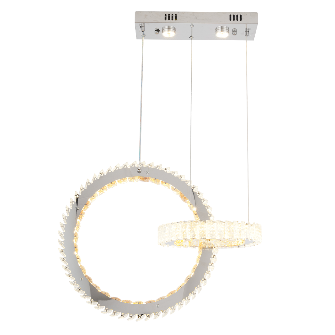 La "lámpara Zania"es una pieza impactante de diseño moderno que juega con formas circulares suspendidas en equilibrio visual. Sus aros con incrustaciones de cristales facetados y luz LED integrada crean un efecto deslumbrante que ilumina con elegancia y dinamismo. Ideal para comedores, vestíbulos o espacios contemporáneos que buscan protagonismo y sofisticación.