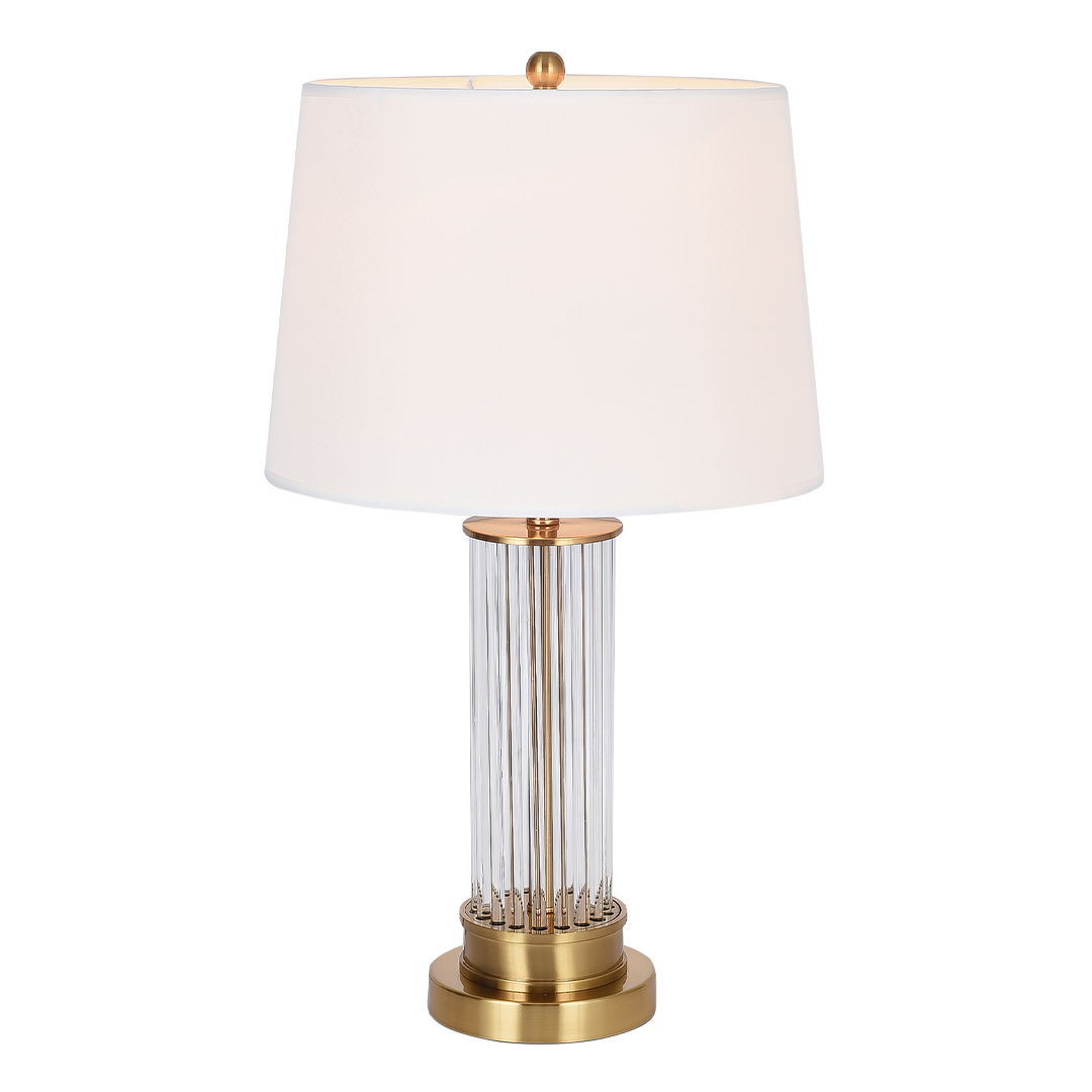 La "lámpara Tussein" es una pieza que irradia sofisticación atemporal. Su base cilíndrica combina varillas de cristal transparente con acentos en dorado brillante, creando un efecto visual refinado. Coronada con una pantalla de lino blanco, ofrece una iluminación cálida y suave, ideal para recámaras, salas o espacios de lectura con un toque de lujo discreto.