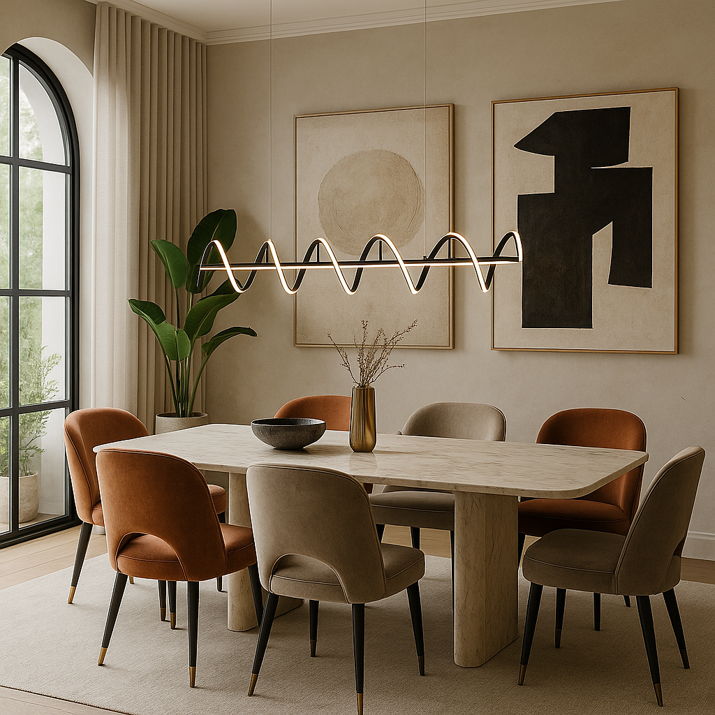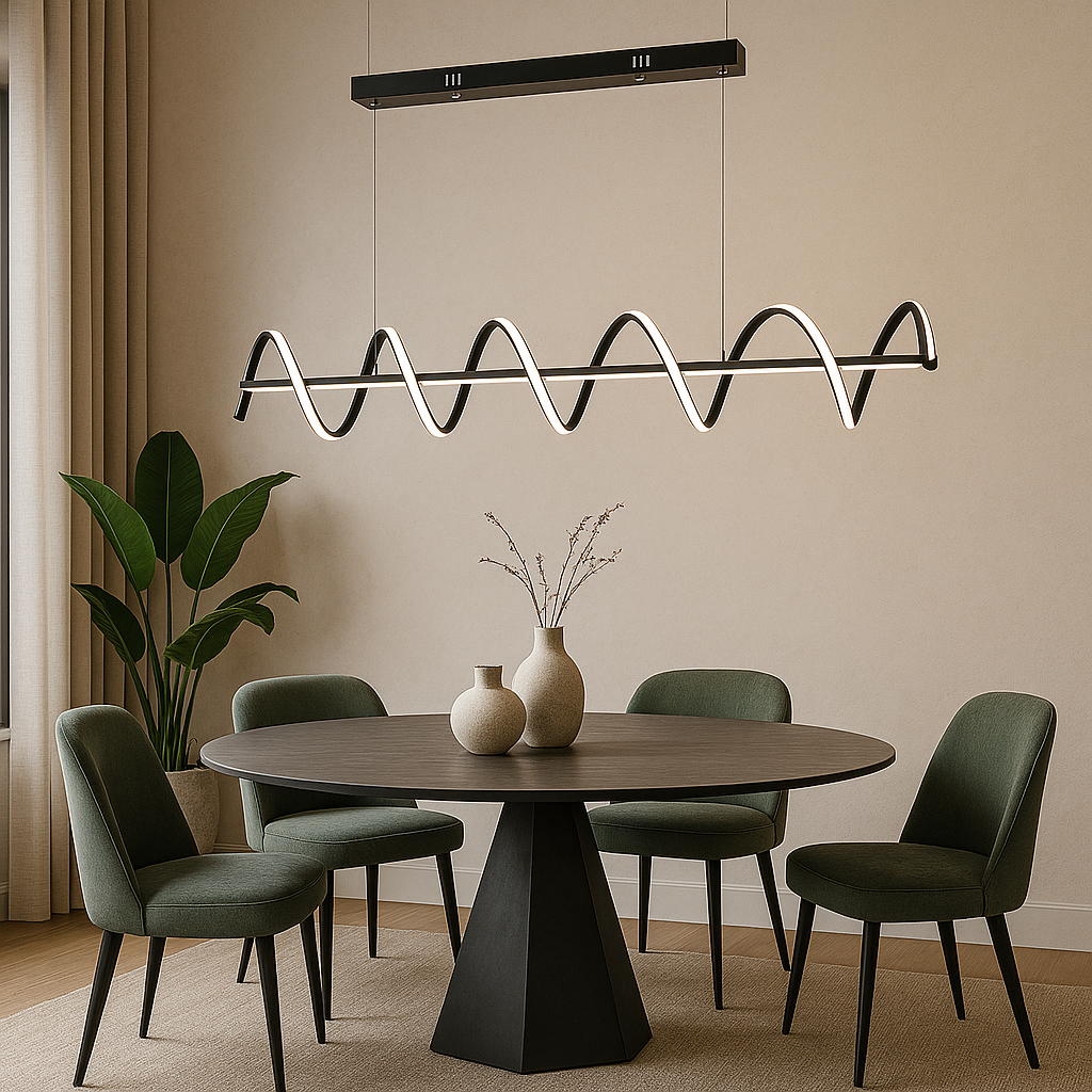 Lámpara Helixa transforma una simple línea en una danza continua de luz. Su estructura metálica negra sostiene una espiral LED que evoca dinamismo y fluidez, convirtiéndola en una pieza ideal para espacios modernos y creativos.