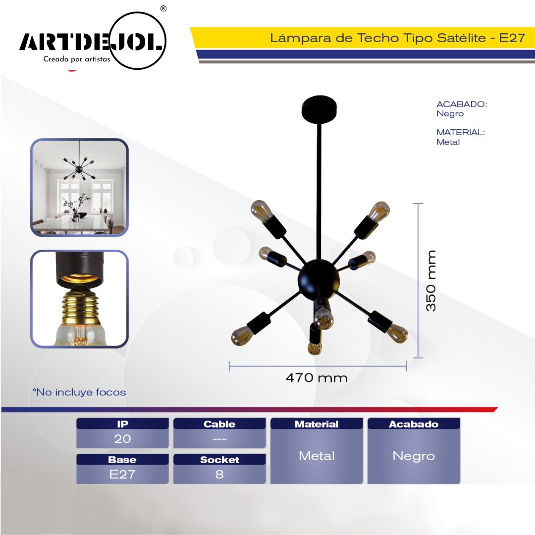 Cada uno de sus 8 brazos culmina con un portalámparas que permite jugar con distintos estilos de focos, desde Edison cálidos hasta opciones más neutras, adaptándose al ambiente que desees crear.
