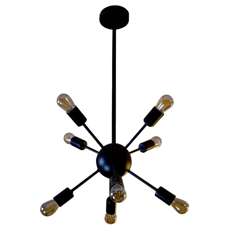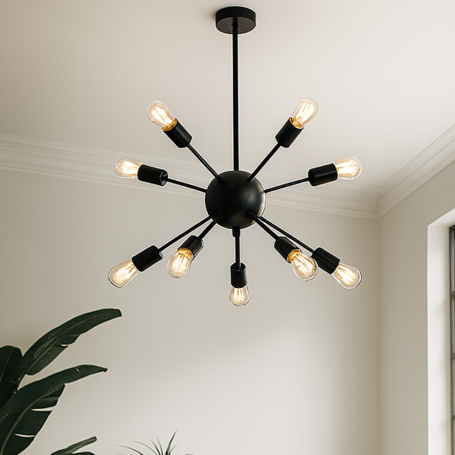 Lámpara Colgante “Estelar" – Chandelier de Lujo 8 luces es una lámpara colgante de diseño radial que parte de una esfera central para proyectar luz en todas direcciones, como una explosión controlada de energía. Su acabado en negro mate y su estética industrial hacen de esta pieza un statement visual ideal para interiores modernos y creativos.