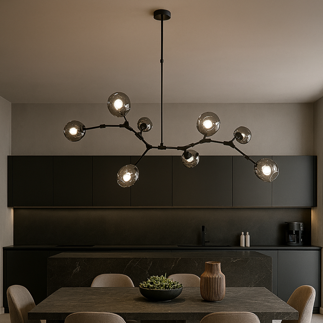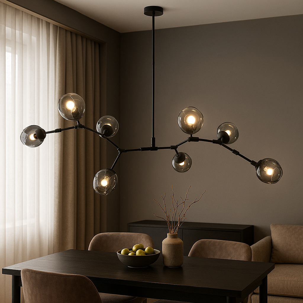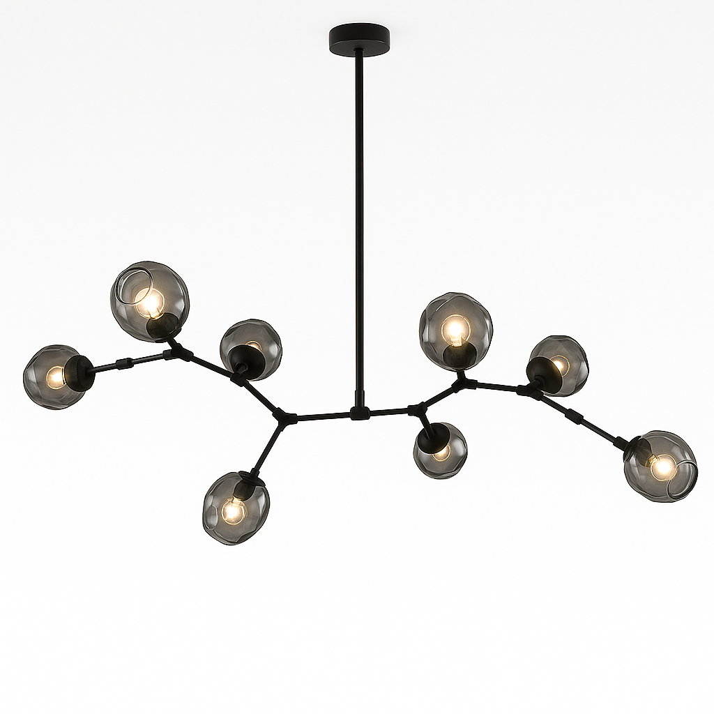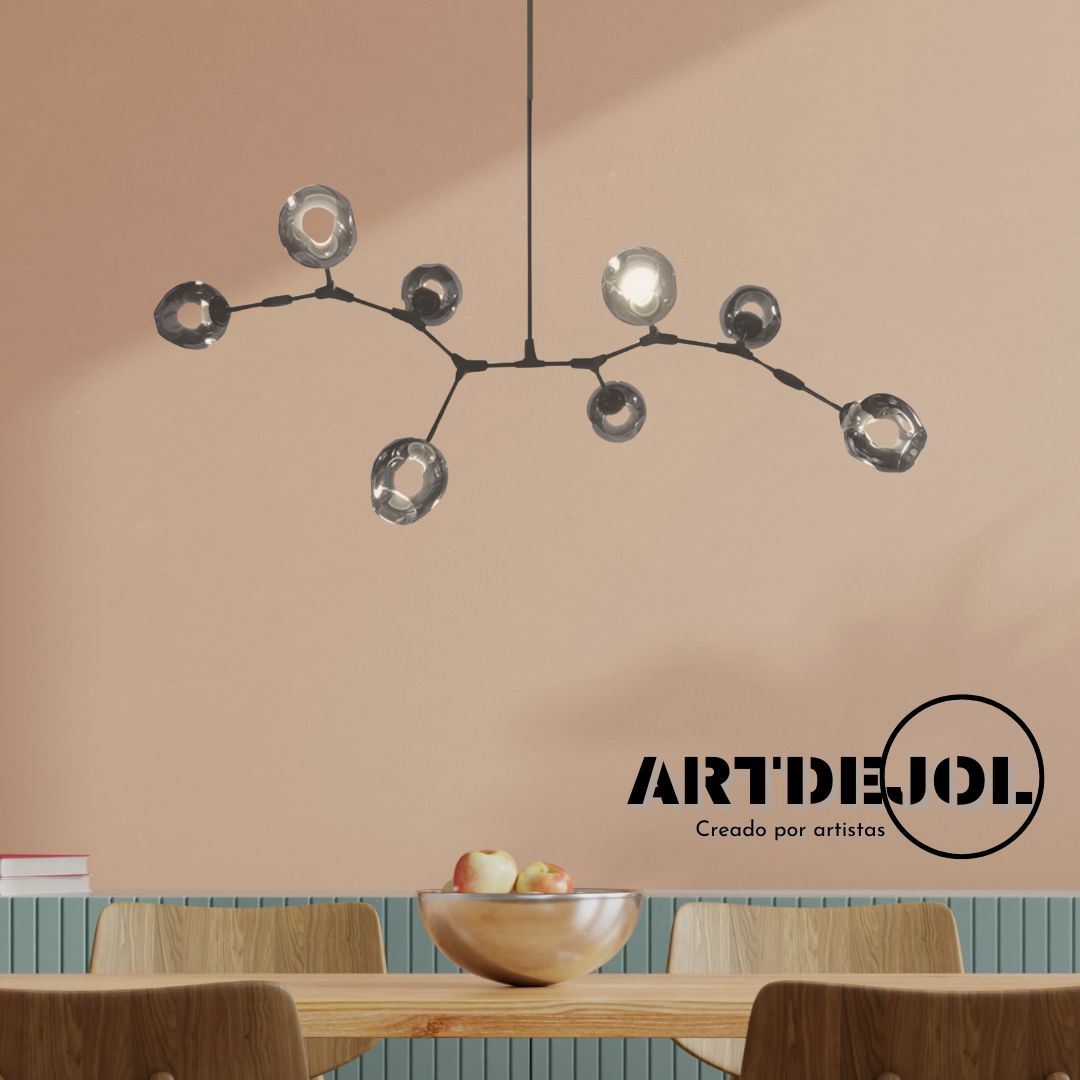 La Lámpara Branca 8 focos se inspira en las formas naturales de las ramas, creando una silueta escultural que combina lo orgánico con lo urbano. Sus brazos metálicos se extienden en distintas direcciones, sosteniendo esferas de cristal ahumado que brindan una iluminación tenue y envolvente.