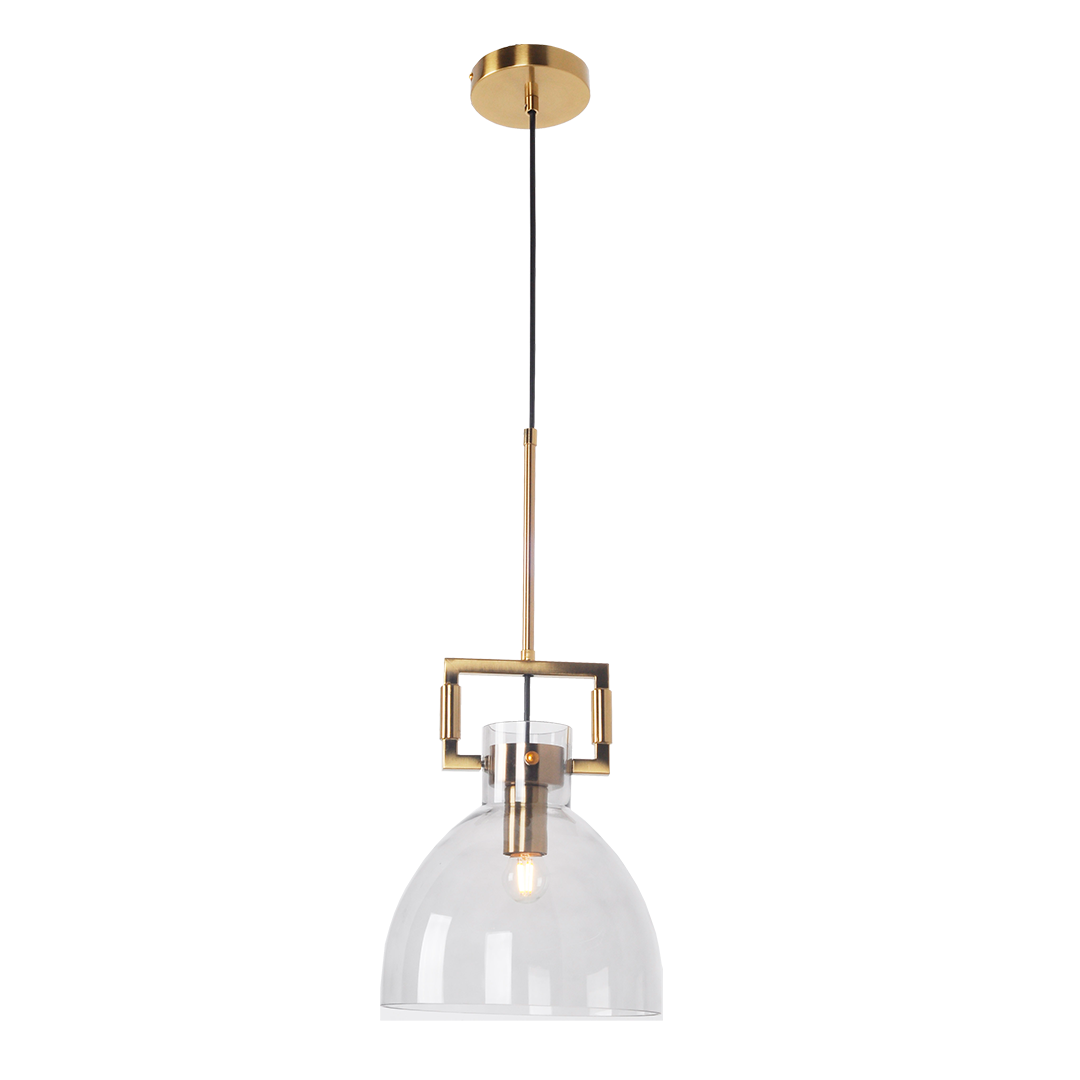 Ideal para iluminar comedores, cocinas o espacios de trabajo, esta lámpara colgante agrega un toque industrial y contemporáneo a cualquier habitación. El contraste entre el dorado del metal y la claridad del cristal crea una pieza llamativa que resalta por su sencillez y elegancia.