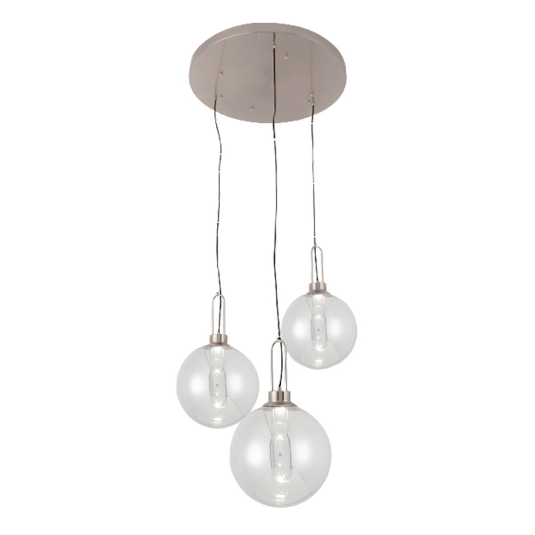 La "Lámpara Cambú" destaca por su diseño minimalista, sostenida por un fino soporte tipo hilo que le confiere ligereza visual. Sus bombillas esféricas en acabado níquel satinado proyectan una iluminación suave y equilibrada, aportando un toque contemporáneo a cualquier ambiente.