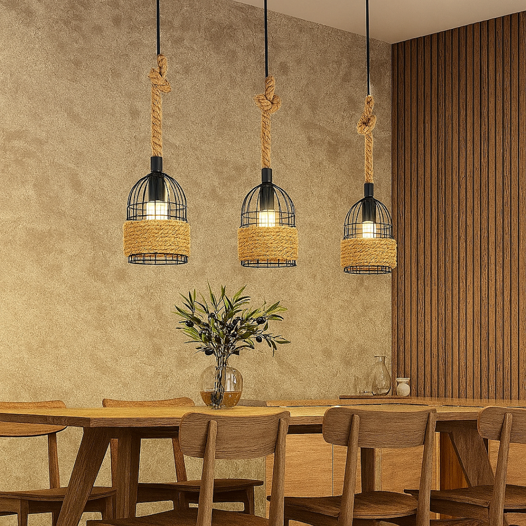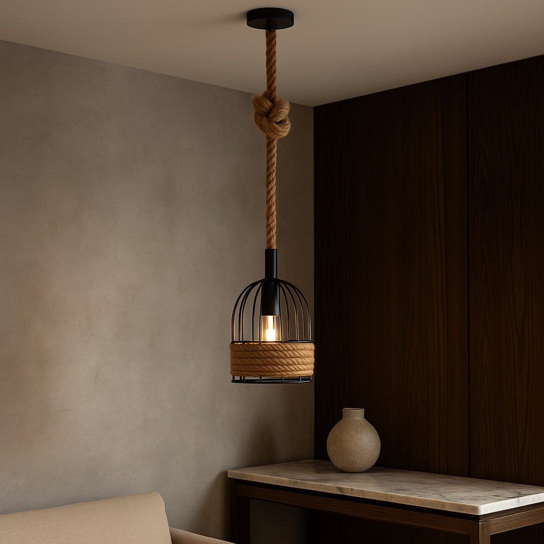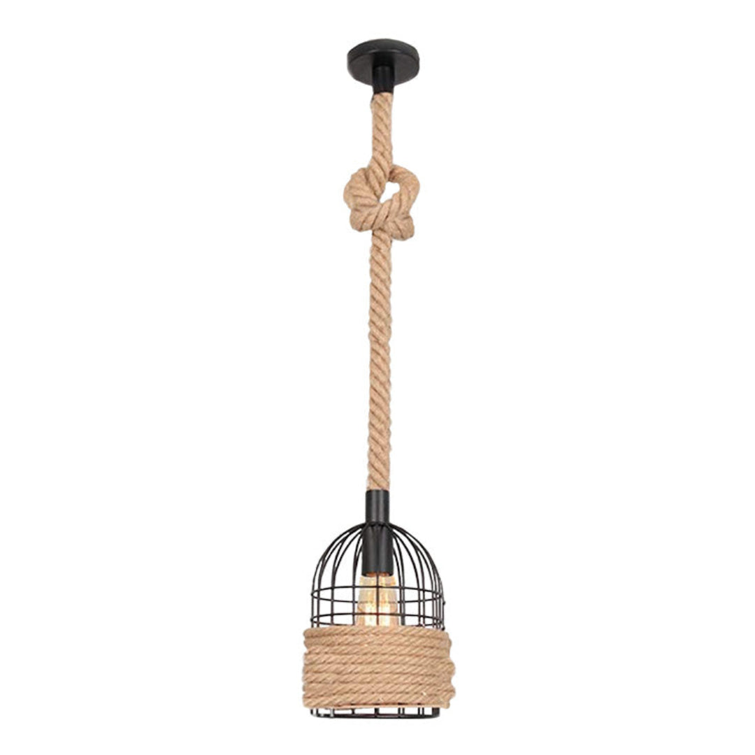 Lámpara Colgante Jaula con Soga Natural – E27 Estilo Industrial Rústico