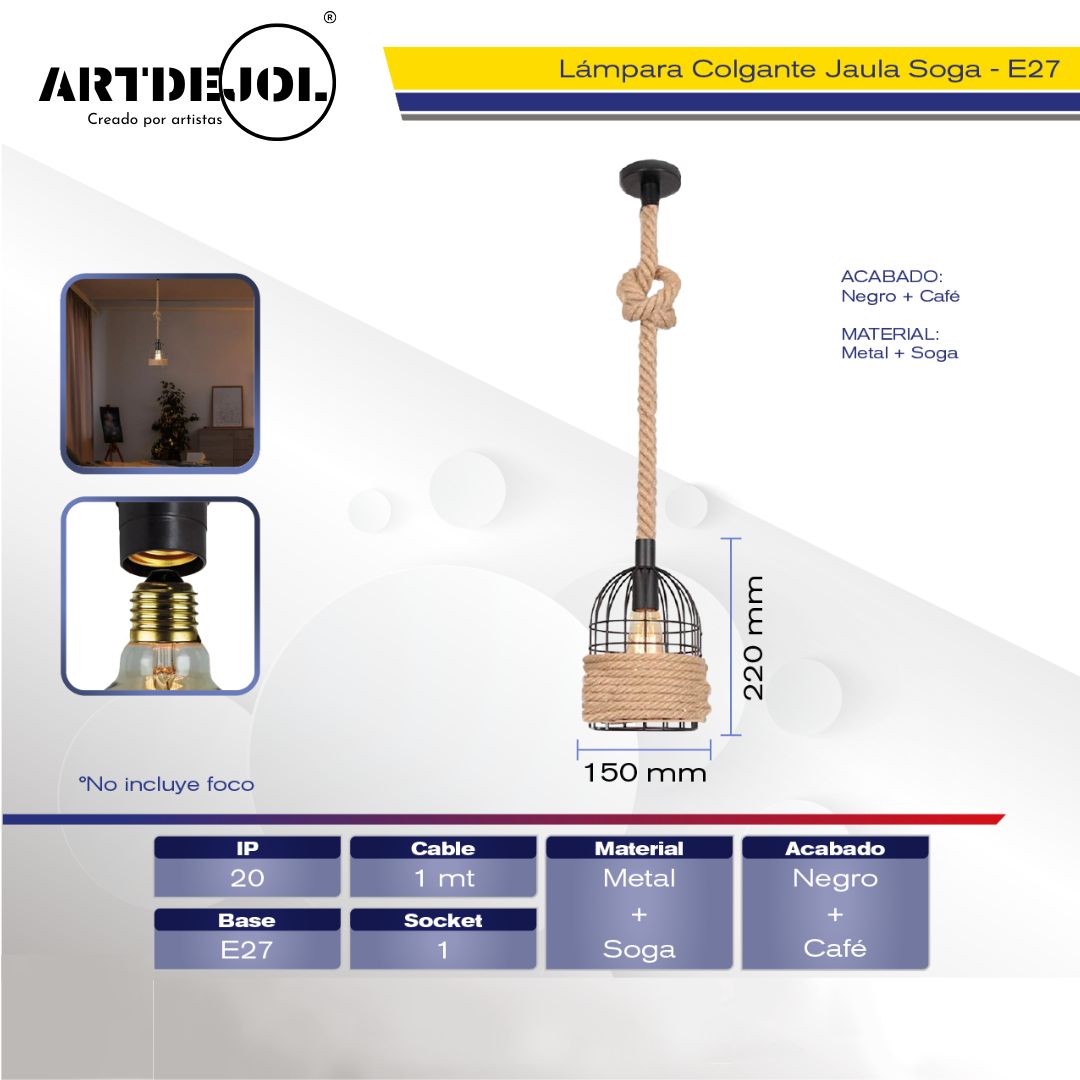 Agrega un toque cálido, rústico y con carácter a tus espacios con nuestra Lámpara Colgante Jaula con Soga Natural. El diseño combina una jaula metálica en acabado negro con un detalle envolvente de soga café, creando una pieza perfecta para ambientes tipo industrial, boho o coastal chic.