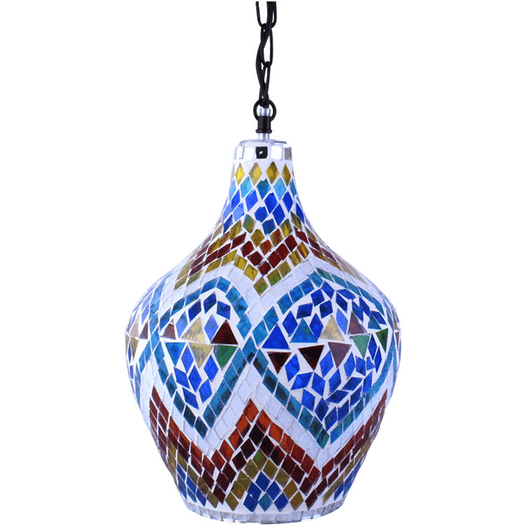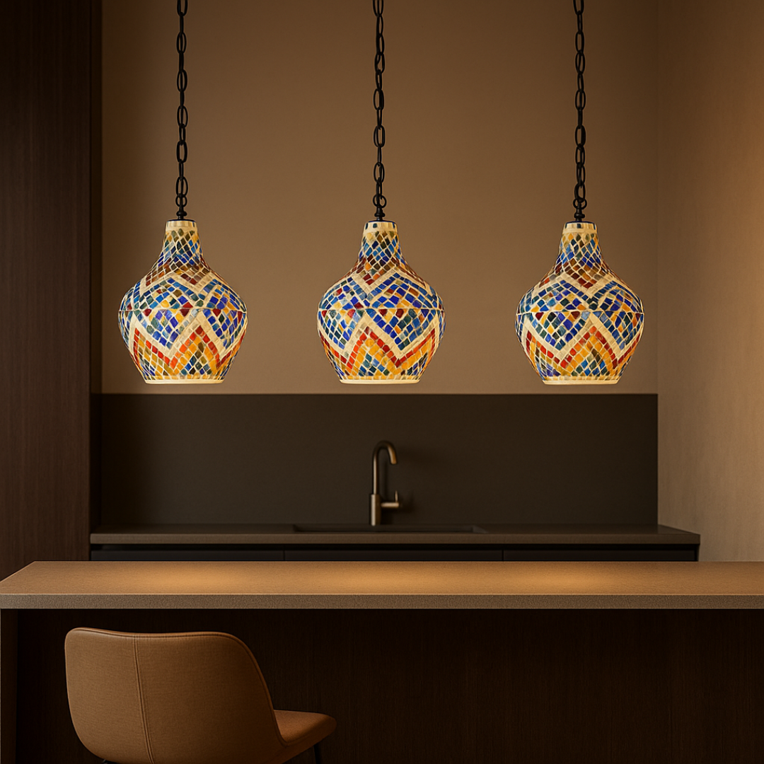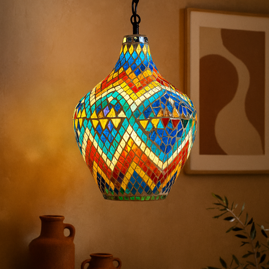 Transforma tu espacio con la belleza artesanal de la lámpara colgante Mosaico Mediterráneo. Cada pieza de vidrio ha sido meticulosamente colocada para crear un diseño vibrante e hipnótico que ilumina con calidez y carácter cualquier rincón. Inspirada en el arte tradicional del mosaico, esta lámpara es perfecta para interiores con alma: desde comedores bohemios hasta recibidores con personalidad.