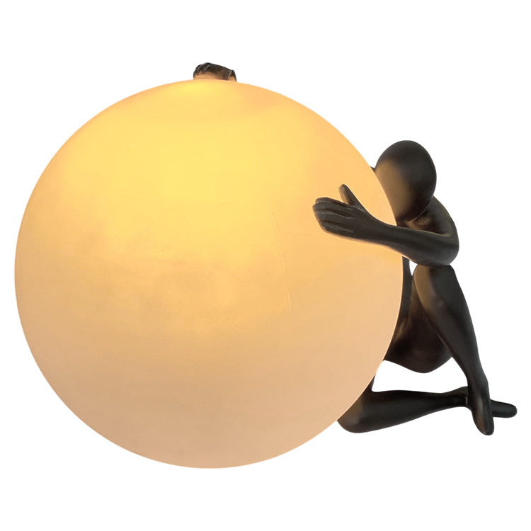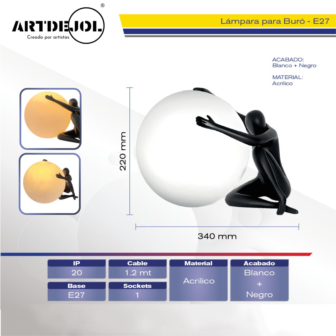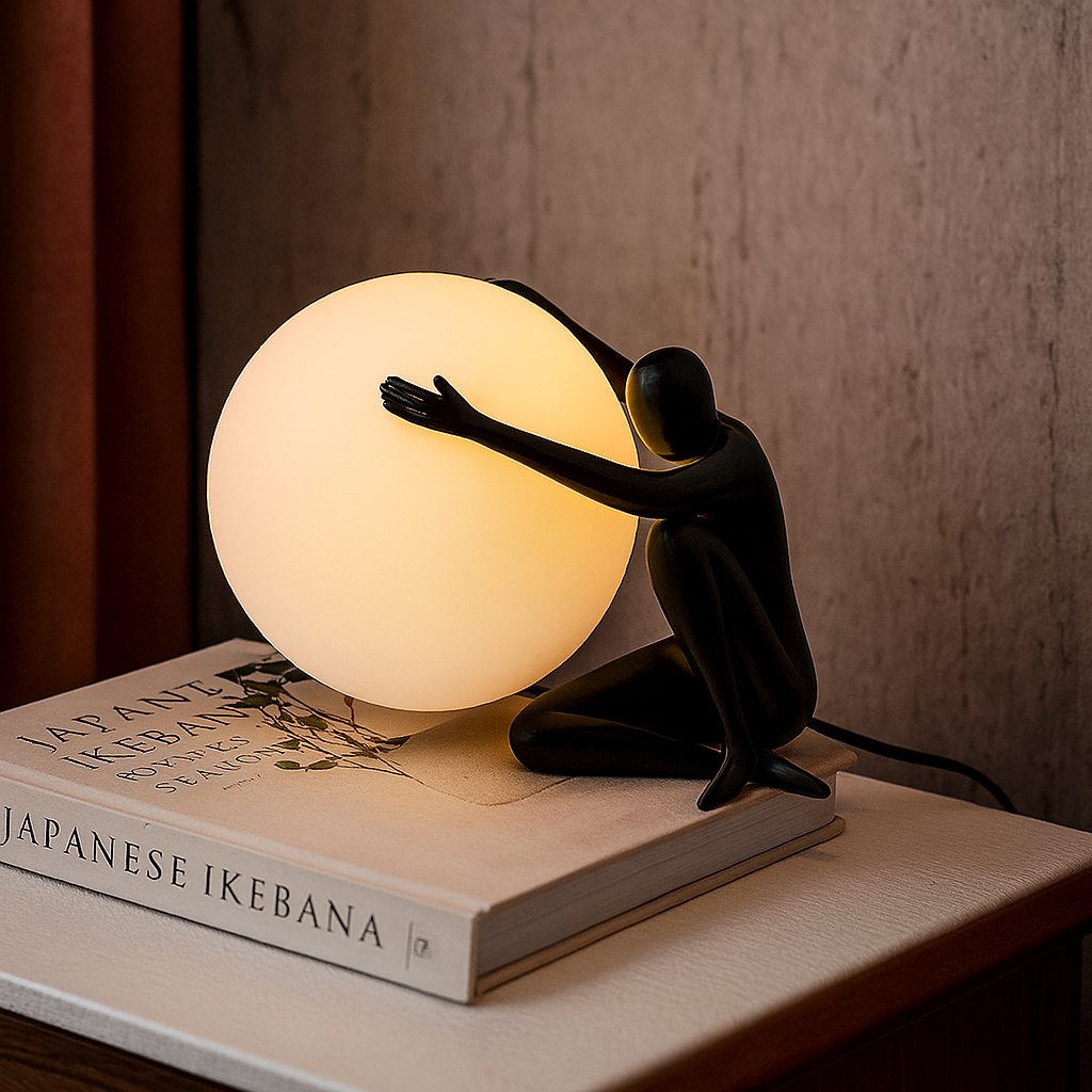 Ilumina tu espacio con arte y diseño con la lámpara de mesa Abrazo Lunar. Una figura estilizada abraza una esfera luminosa, creando una pieza única y escultural que combina iluminación funcional con estética contemporánea. Ideal para burós, escritorios o espacios creativos que merecen un toque distinto.