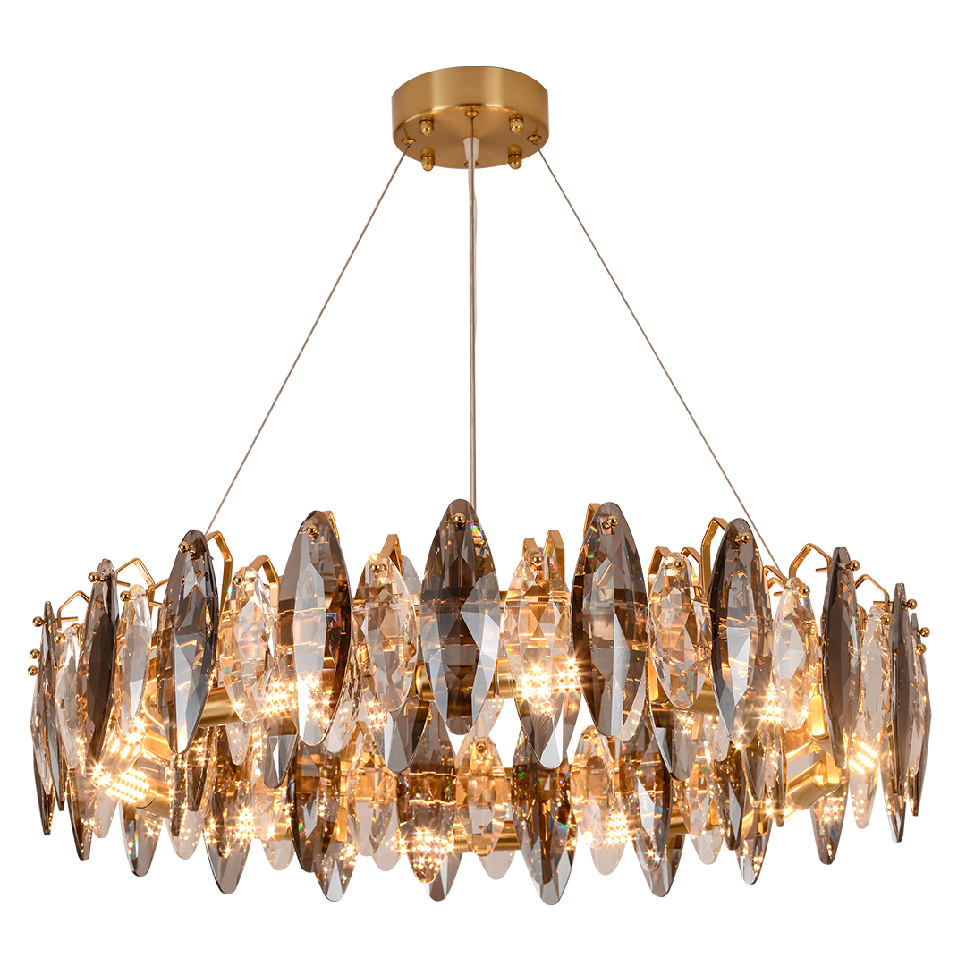 La "Lámpara Forte" es Ideal para comedores, salas o cualquier área que requiera un elemento decorativo impresionante. La combinación de su forma única y el brillo de los cristales garantiza una iluminación perfecta mientras enriquece la estética del entorno.