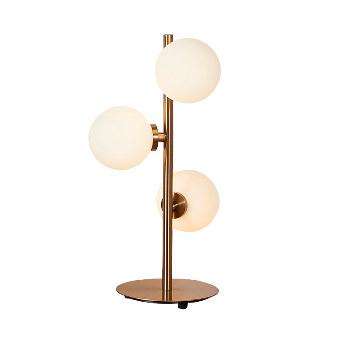 La "Lámpara Riflesso" aporta un toque de sofisticación a cualquier espacio con su diseño moderno y minimalista. Su base metálica en acabado dorado sostiene tres esferas de vidrio blanco opaco que emiten una luz cálida y acogedora. Perfecta para iluminar de manera suave y elegante, esta lámpara se adapta tanto a ambientes de oficina como a salas de estar, ofreciendo una atmósfera relajante.