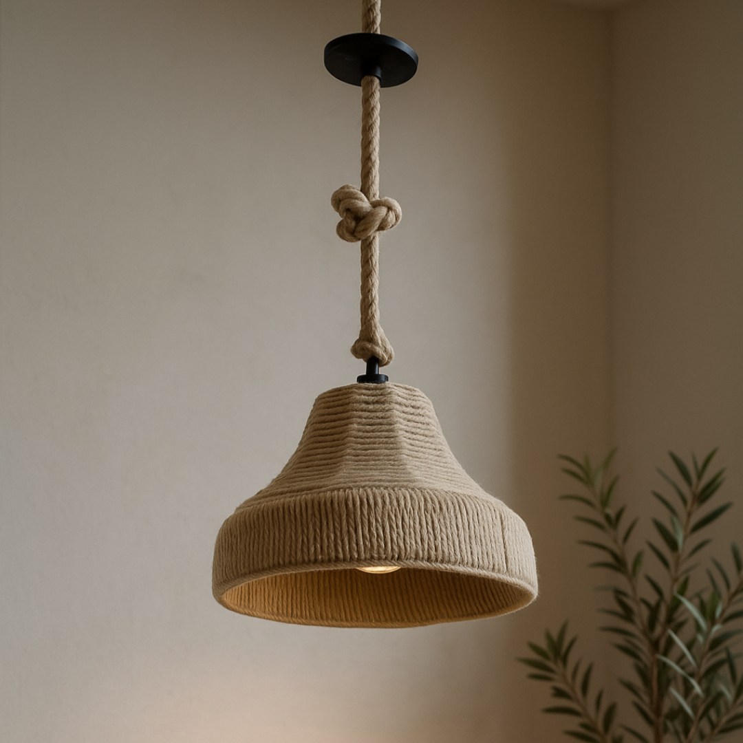 Lámpara Liana es una luminaria colgante que combina lo artesanal con lo contemporáneo. Su estructura envuelta en cuerda natural transmite una calidez orgánica que convierte cualquier espacio en un refugio acogedor.