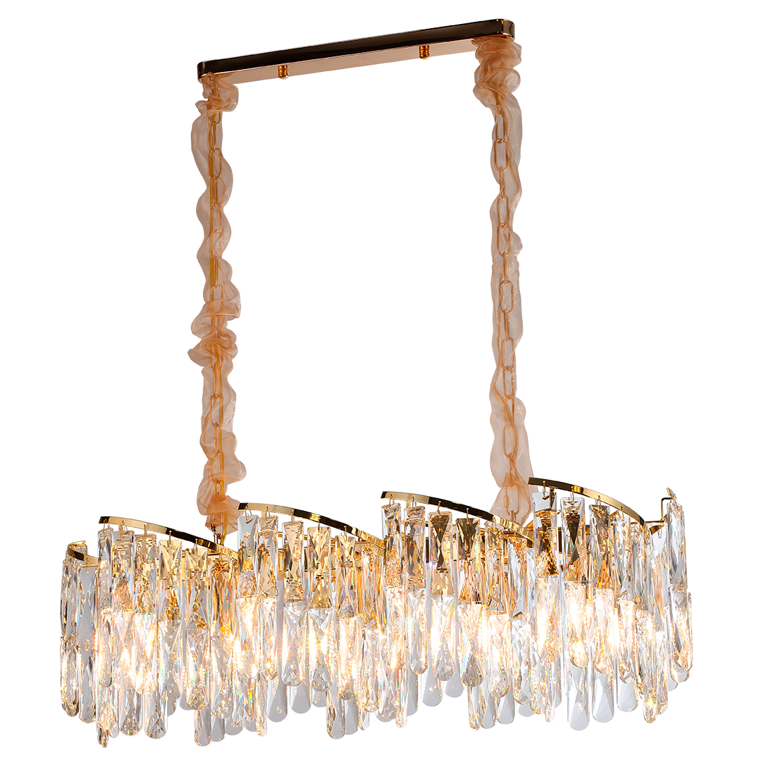 La "Lámpara Maestroso" es sinónimo de lujo y elegancia. Su estructura en acabado dorado sostiene una cascada de cristales tallados que reflejan la luz de manera espectacular, creando un efecto brillante y sofisticado. Suspendida con delicados detalles en tela, esta pieza es ideal para comedores o salones donde se busca un impacto visual refinado y majestuoso.