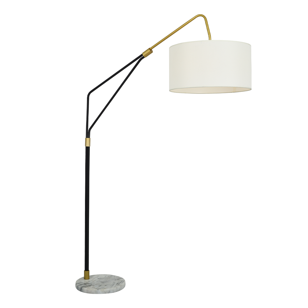 La "lámpara Maniati" combina materiales clásicos con líneas contemporáneas. Su estructura metálica en negro y dorado contrasta armoniosamente con una base de mármol blanco y una pantalla textil en tono neutro. Ideal para espacios que buscan sofisticación y diseño funcional en un solo elemento.