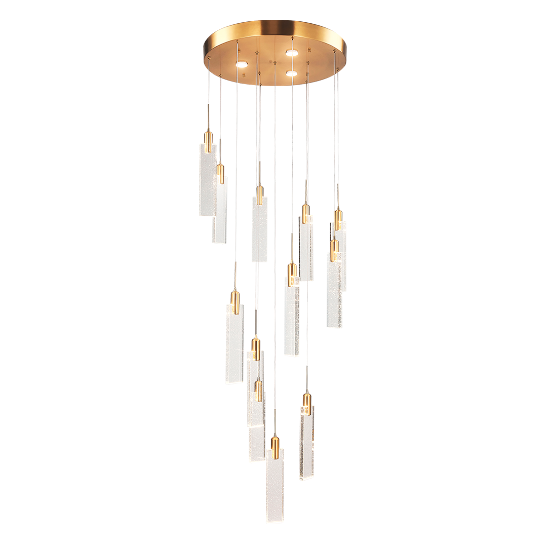 La "lámpara Minimalist" redefine la elegancia moderna con una composición de múltiples luces suspendidas desde una base circular dorada. Cada luz desciende en líneas limpias con acabados en cristal y detalles metálicos que reflejan sutilmente la luz. Ideal para espacios sofisticados y minimalistas que buscan un impacto visual sin excesos.