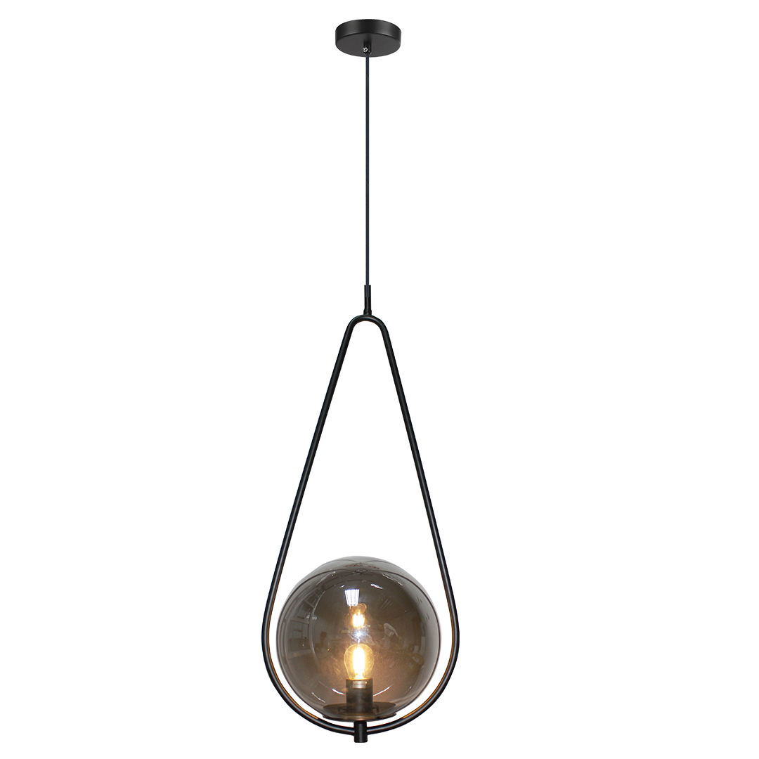 La" lámpara Sicilia"es una pieza de diseño vanguardista que evoca la fluidez y delicadeza de una gota suspendida en el aire. Su estructura metálica en acabado negro mate enmarca con elegancia una esfera de vidrio ahumado, creando un contraste sofisticado y moderno.
