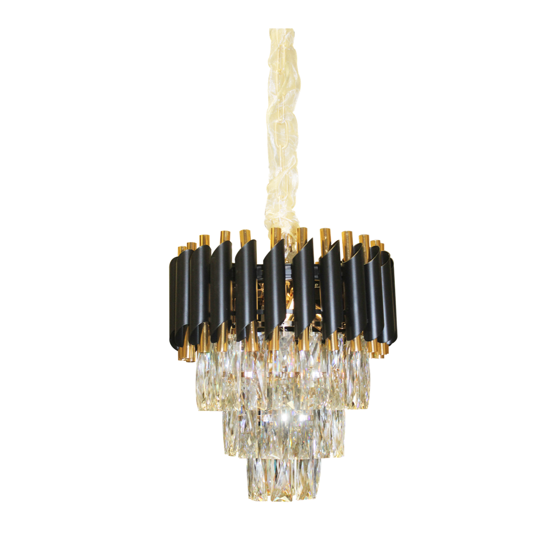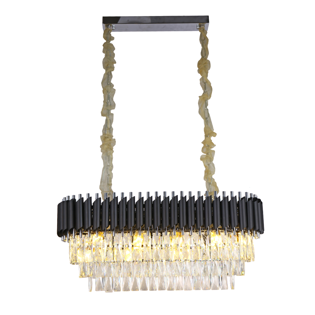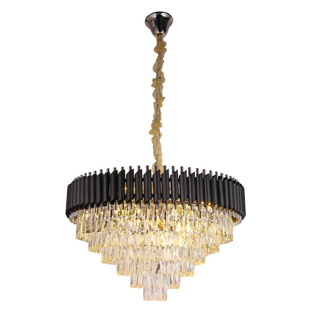 La Lámpara Stravaganti es una joya colgante que equilibra la opulencia del cristal con la fuerza del diseño contemporáneo. Su estructura escalonada de prismas de vidrio refleja la luz con un brillo hipnótico, mientras que la corona de detalles metálicos oscuros añade un contraste sofisticado. Ideal para recibidores, comedores o escaleras de doble altura, esta pieza es una declaración de lujo moderno con personalidad audaz.