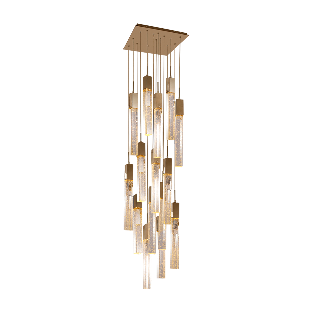 La "Lámpara Toscana" redefine la elegancia vertical. Con múltiples luces suspendidas en delicado cristal burbuja y un acabado dorado que resalta cada detalle, esta lámpara colgante es una obra de arte luminosa. Ideal para escaleras, recibidores o techos altos que buscan un toque de sofisticación contemporánea y lujo arquitectónico.