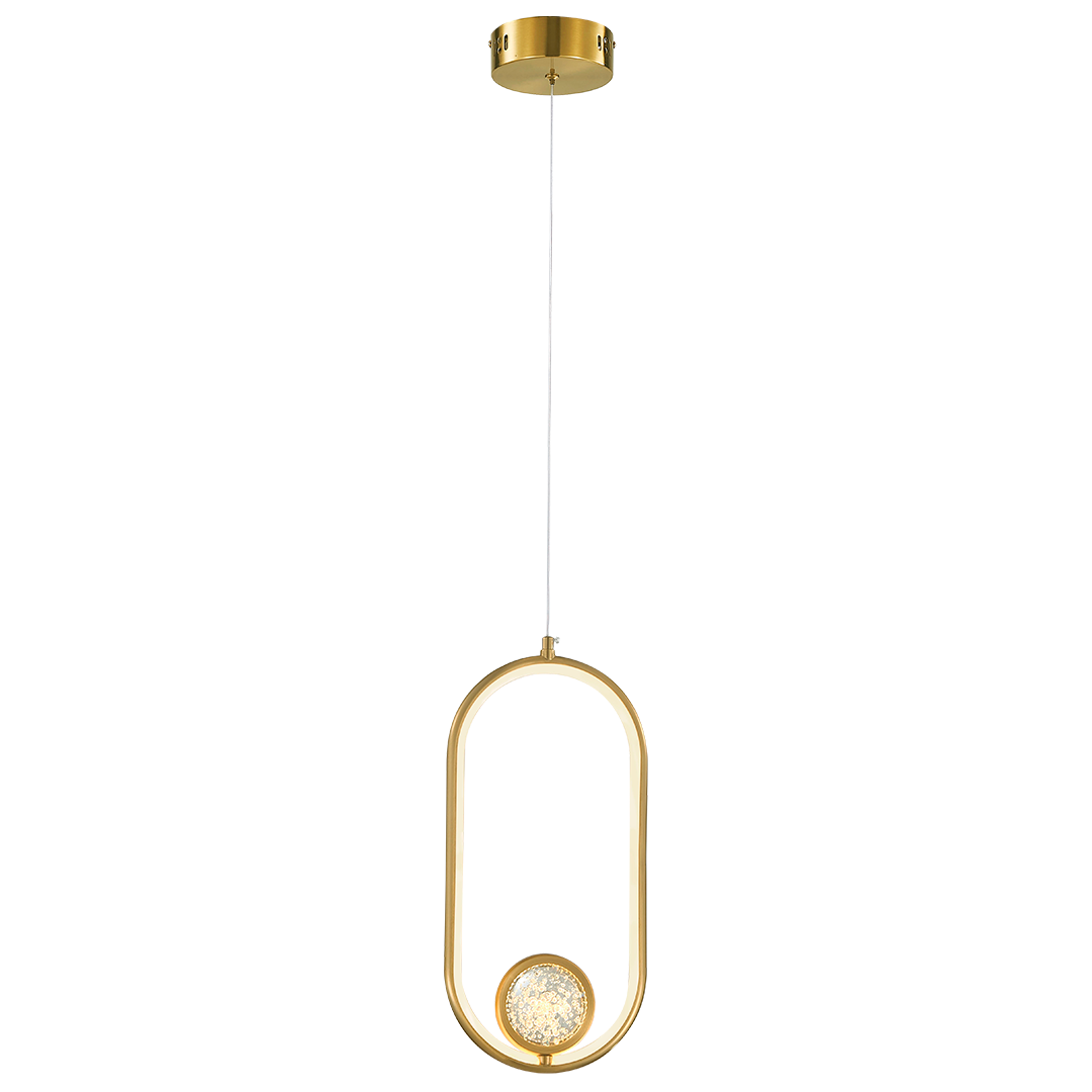 La "lámpara Vaticano" es una expresión de equilibrio y sofisticación con un diseño minimalista y contemporáneo. Su estructura metálica en acabado dorado forma un óvalo elegante que enmarca una esfera luminosa de cristal texturizado, la cual emite una luz cálida y difusa, generando un efecto visual armonioso y envolvente.