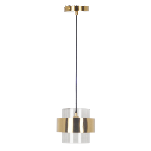 La "Lámpara Xenn Light" juega con formas cilíndricas y contrastes de materiales. Su diseño combina un aro metálico dorado con un cuerpo de cristal transparente, logrando una pieza moderna y escultural. Perfecta para espacios donde se busca una iluminación puntual con un toque artístico, como barras, mesitas laterales o rincones especiales.