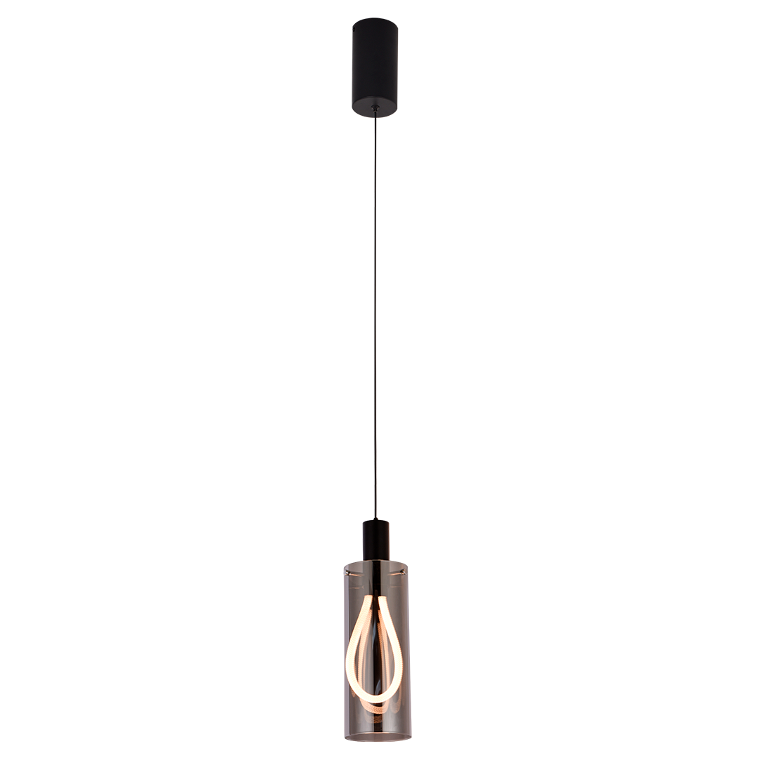 La "lámpara Zermatt" combina elegancia contemporánea y diseño artístico con su cuerpo cilíndrico de cristal ahumado y luz LED integrada en forma de gota. Ideal para acentos decorativos en barras, recibidores o rincones modernos que buscan sofisticación con personalidad.