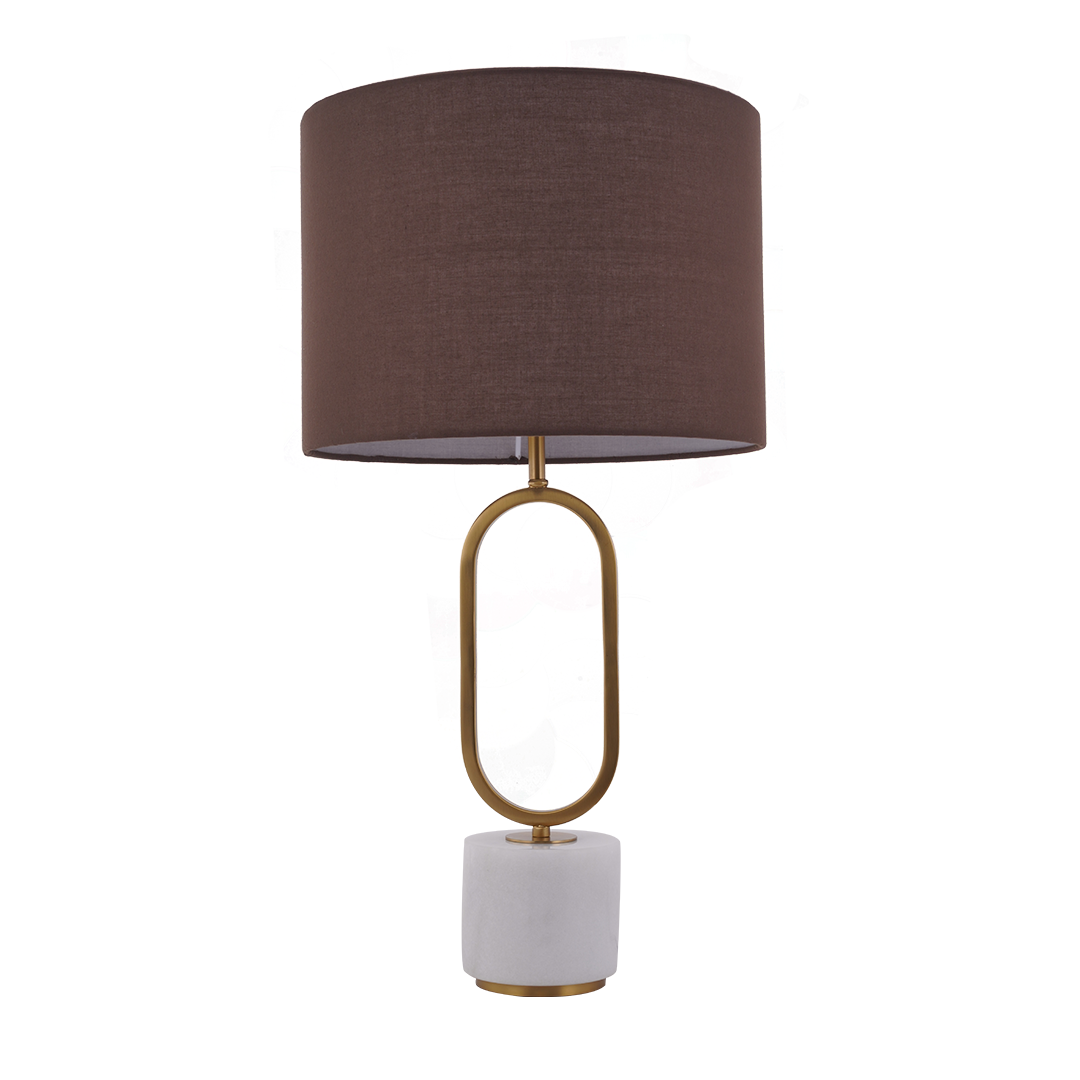 La "Lámpara Ovalu" destaca por su silueta esbelta y su juego de formas geométricas. Su base de mármol blanco aporta estabilidad y sofisticación, mientras el marco ovalado de latón sostiene una pantalla en tono chocolate que emite una luz cálida y acogedora. Perfecta para interiores modernos y clásicos que buscan un toque de diseño refinado.