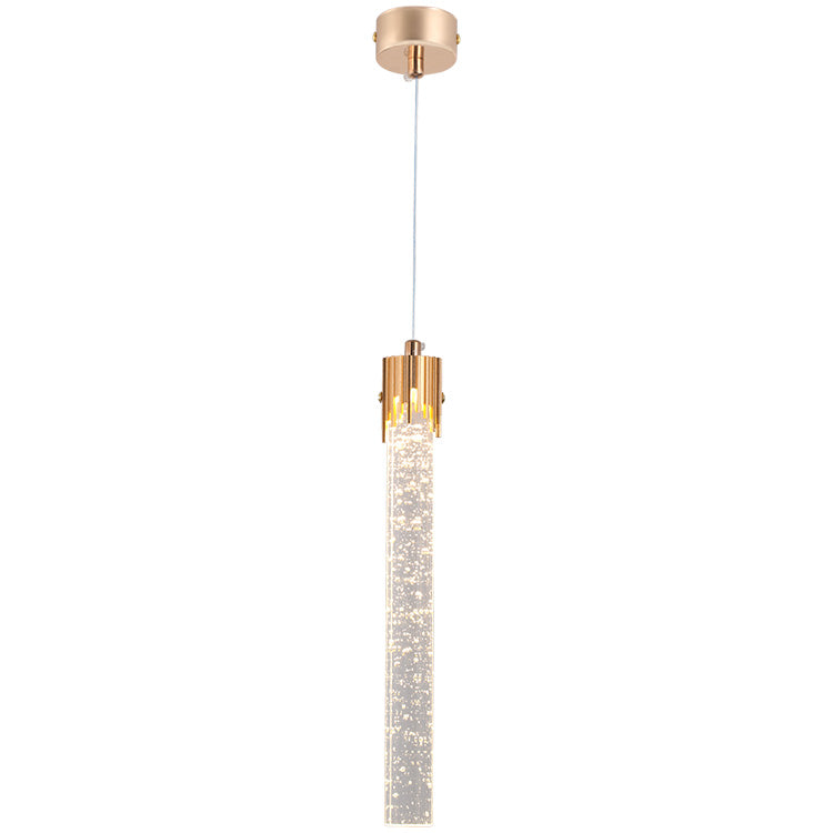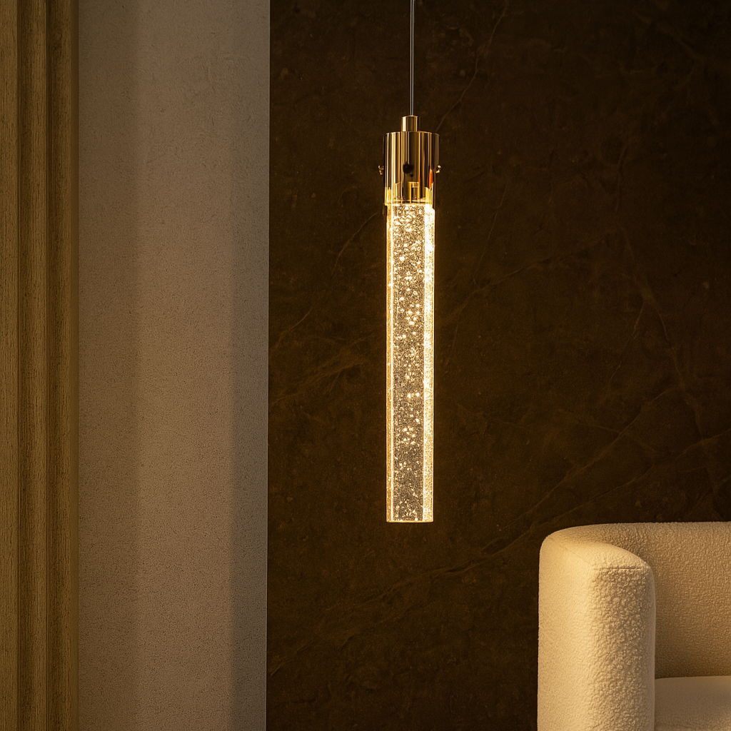 Lámpara Brünna captura la esencia del diseño moderno con un toque de sofisticación dorada. Su cuerpo alargado de acrílico burbujeante, bañado en luz cálida, genera un efecto visual hipnótico que evoca la efervescencia de una copa de champagne.