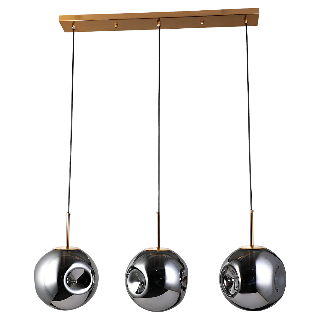 La "Lámpara Crepuscolo" es una pieza moderna y sofisticada que presenta tres esferas reflectantes suspendidas por cables delgados y una base dorada. Su diseño único combina acabados brillantes con un toque de lujo, creando una iluminación elegante y funcional. Ideal para iluminar comedores, salas de estar o áreas de trabajo, esta lámpara añade una atmósfera cálida y contemporánea a cualquier habitación.