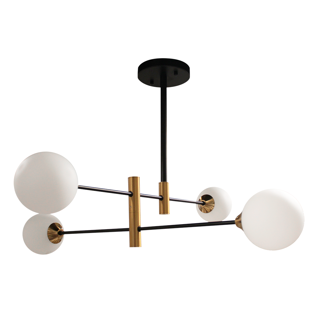 La "Lámpara Genova" es la combinación perfecta de modernidad y elegancia. Su estructura de líneas rectas y esferas opacas de vidrio se destaca con los detalles dorados en los soportes. Esta lámpara de techo aporta un toque sofisticado y contemporáneo a cualquier espacio.