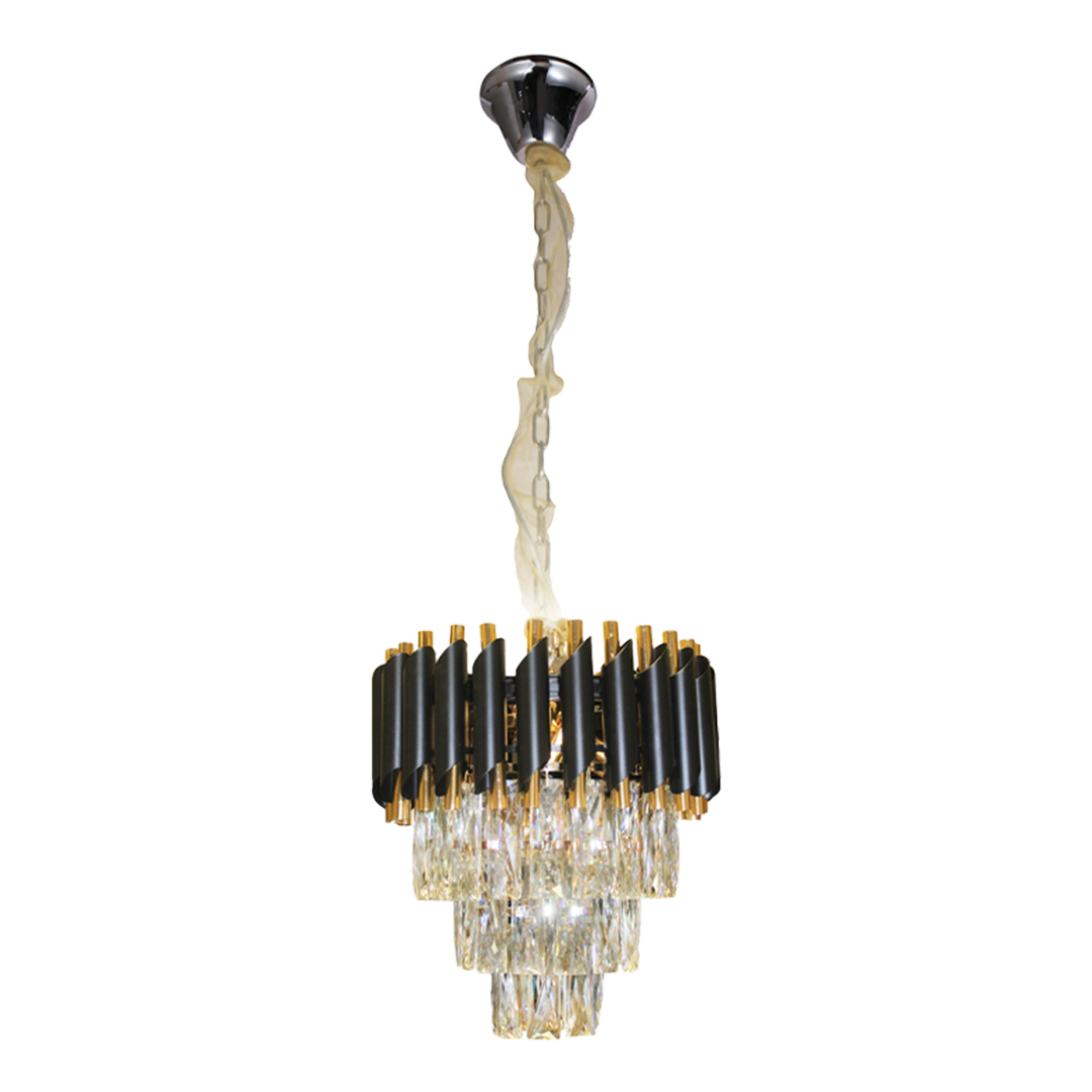 La "Lámpara Stilo" es una pieza que encarna el lujo y la sofisticación con un diseño imponente y elegante. Su estructura combina detalles en negro y dorado, creando un contraste audaz y refinado. En la parte inferior, una cascada de cristales tallados desciende en niveles, reflejando la luz con un brillo deslumbrante y aportando un aire de glamour contemporáneo.