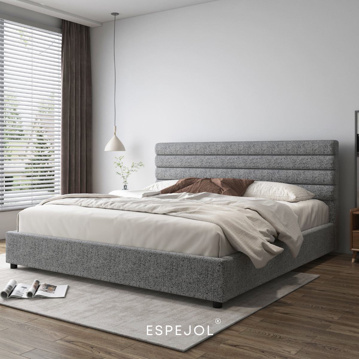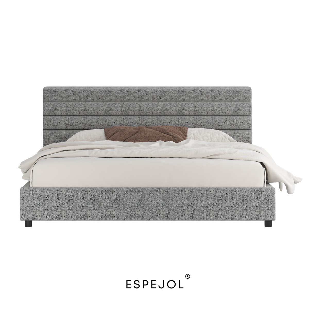 Cabecera tapizada en líneas horizontales, de inspiración arquitectónica, que aporta presencia y elegancia sin esfuerzo.