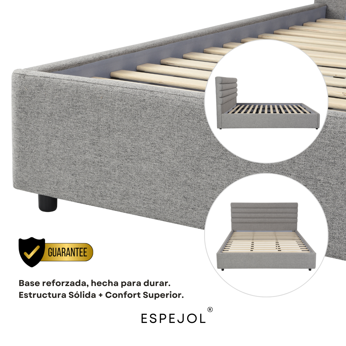 Estructura robusta y sólida, con base firme de alto soporte y patas negras discretas que elevan visualmente el diseño.